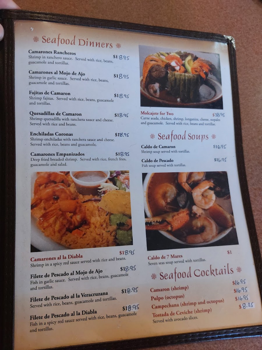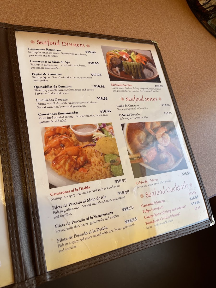 Guests often enjoy hearty breakfast options like the Steak Breakfast Plate or Cheese Enchiladas Rancheras to start the day, while the afternoon and evening menus bring forward vibrant dishes such as Carne Asada Fajitas, Al Pastor tacos, and fresh seafood soups.